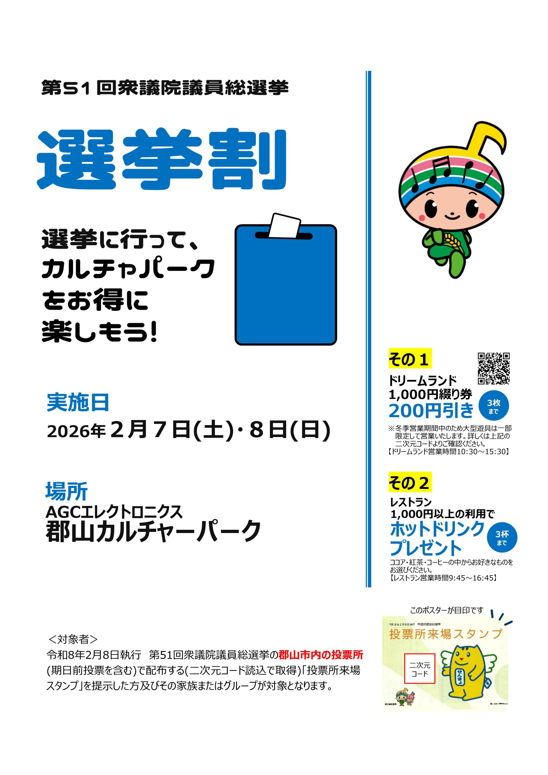 郡山市内の投票所(期日前投票を含む)で配布する「投票所来場スタンプ」を提示した方とその家族またはグループが対象となります。