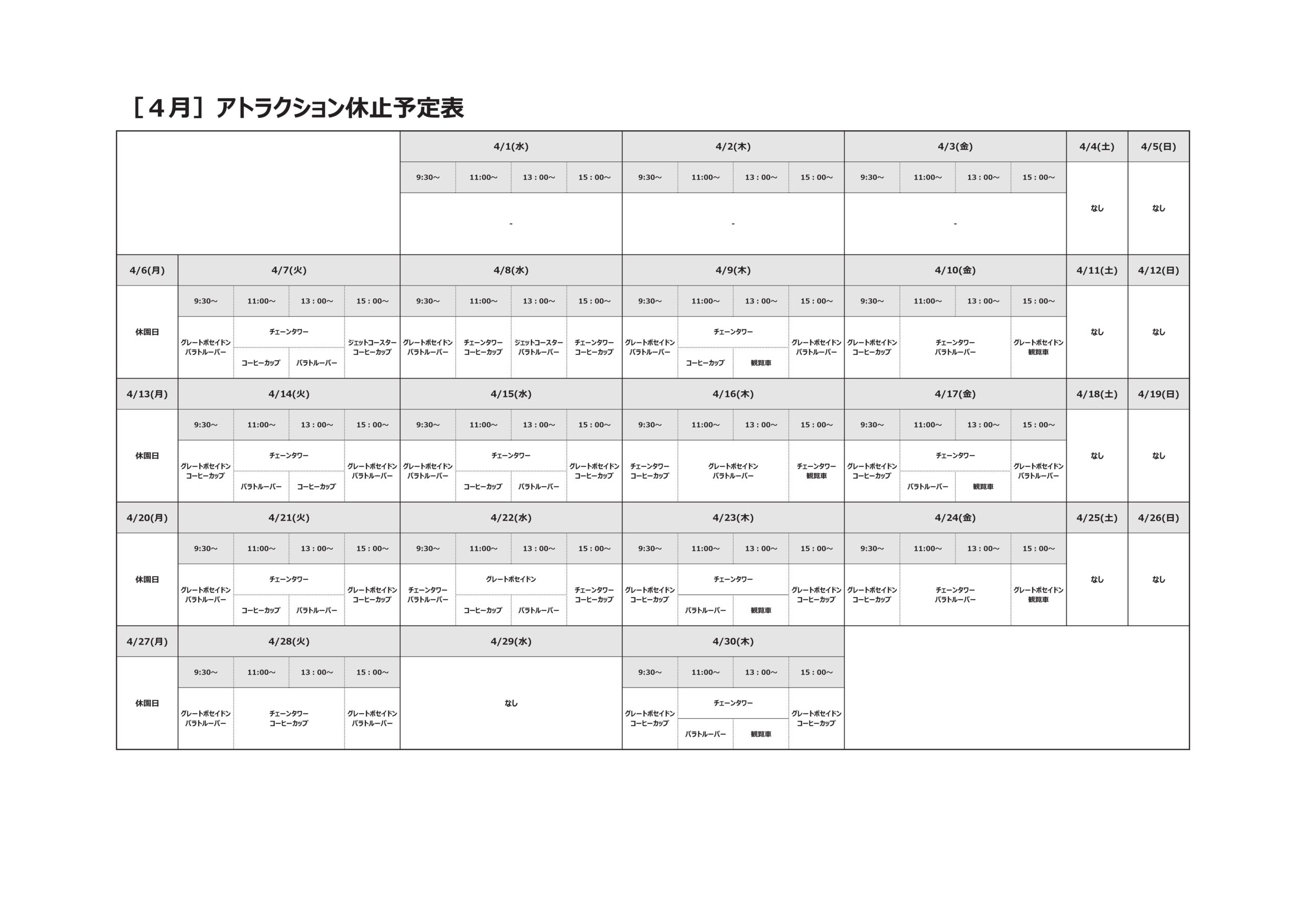 4月7日(火)より、下記のとおりアトラクションが運休となります。ご了承くださいますようお願いいたします。